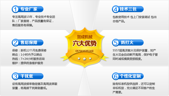 賀成機(jī)械專業(yè)生產(chǎn)高周波設(shè)備、精制高周波模具、供應(yīng)高周波配件和耗材、提供高周波維修、高周波加工及高周波出租服務(wù)。專注高周波15年,為廣大高周波用戶提供一站式采購、服務(wù)平臺(tái)。